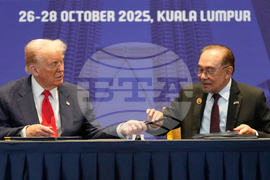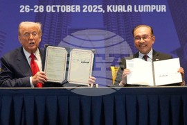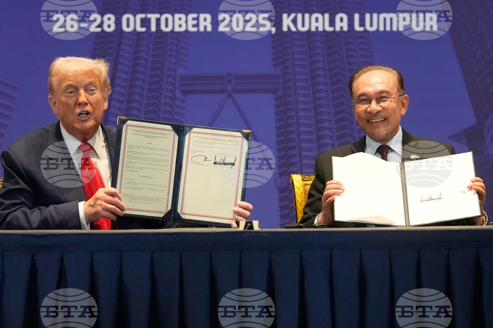 President Donald Trump and Malaysia's Prime Minister Anwar Ibrahim hold up documents after signing a trade agreement on the sidelines of the ASEAN Summit in Kuala Lumpur, Malaysia, Sunday, Oct. 26, 2025. (AP Photo/Mark Schiefelbein)