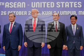 President Donald Trump poses for a photo with Cambodian Prime Minister Hun Manet, left, Malaysian Prime Minister Anwar Ibrahim and Philippine President Ferdinand Marcos Jr. right, at the ASEAN Summit in Kuala Lumpur, Malaysia, Sunday, Oct. 26, 2025. (AP Photo/Mark Schiefelbein)