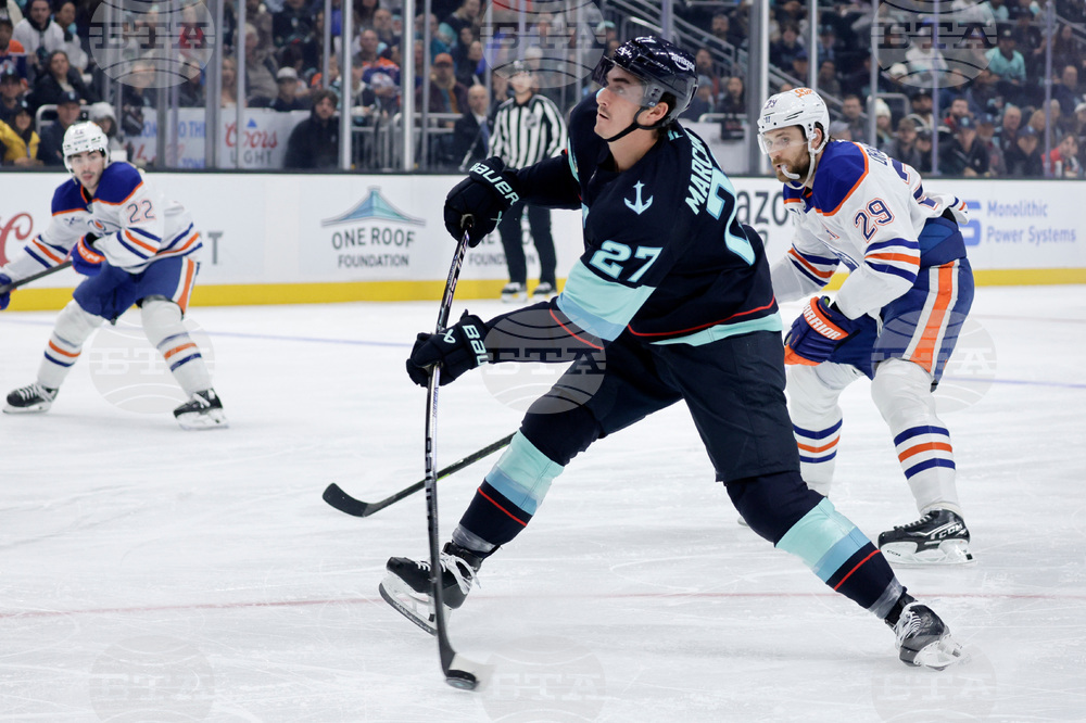 Seattle Kraken left wing Mason Marchment (27) shoots with Edmonton Oilers center Leon Draisaitl (29) behind in the first period of an NHL hockey game Saturday, Oct. 25, 2025, in Seattle. (AP Photo/John Froschauer)