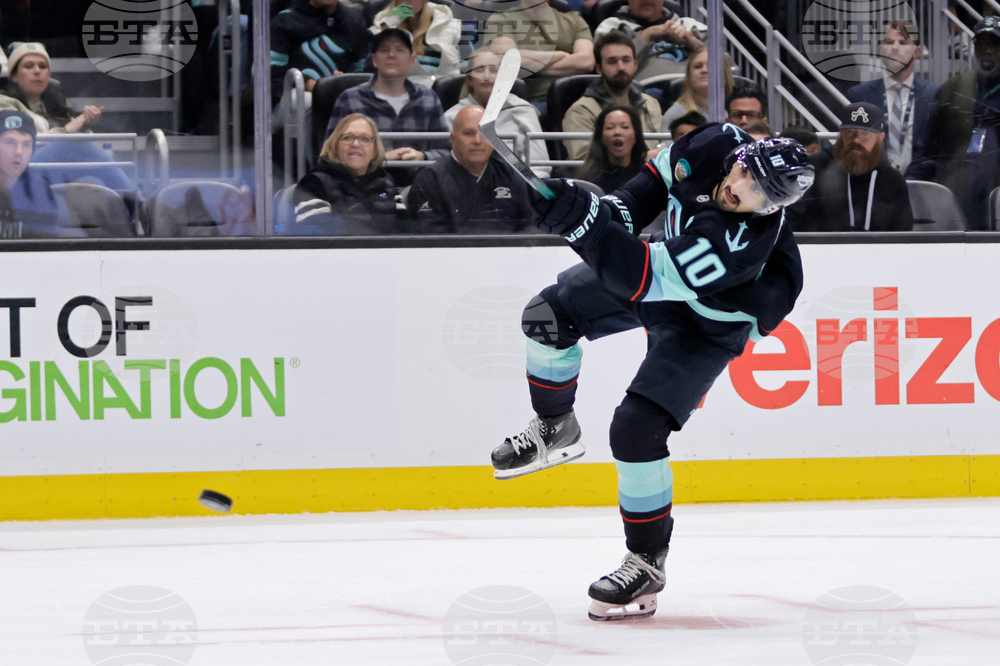Seattle Kraken center Matty Beniers (10) shoots against Edmonton Oilers goaltender Stuart Skinner (74) in the third period of an NHL hockey game Saturday, Oct. 25, 2025, in Seattle. (AP Photo/John Froschauer)