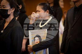 Mourners gather outside Chulalongkorn Hospital in Bangkok, Thailand, Sunday, Oct. 26, 2025. (AP Photo/Sakchai Lalit)
