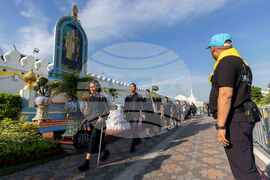 Thai police pay respect as the convoy transporting the body of Queen Mother Sirikit, drives from Chulalongkorn Hospital to the Grand Palace, in Bangkok, Thailand, Sunday, Oct. 26, 2025. (AP Photo/Sakchai Lalit)