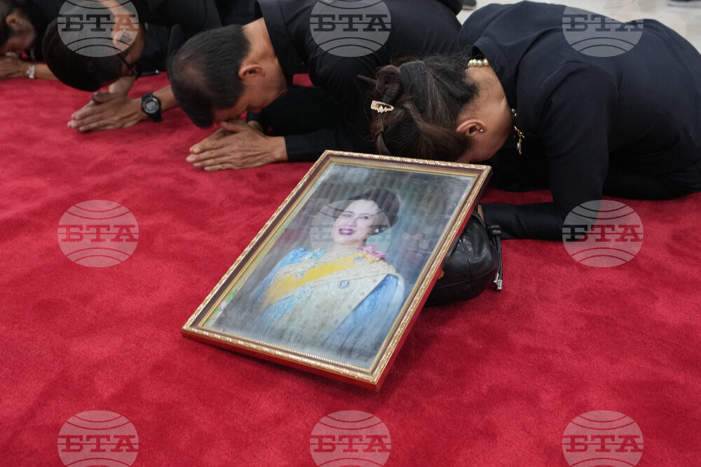 Mourners pray in front of a portrait of Queen Mother Sirikit at Chulalongkorn Hospital in Bangkok, Thailand, Sunday, Oct. 26, 2025. (AP Photo/Sakchai Lalit)