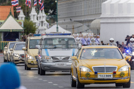 The convoy believed to be transporting the body of Queen Mother Sirikit, drives from Chulalongkorn Hospital to the Grand Palace, in Bangkok, Thailand, Sunday, Oct. 26, 2025. (AP Photo/Sakchai Lalit)