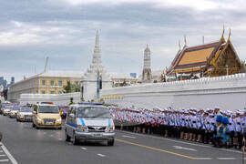 The convoy believed to be transporting the body of Queen Mother Sirikit, drives from Chulalongkorn Hospital to the Grand Palace Bangkok, Thailand, Sunday, Oct. 26, 2025. (AP Photo/Sakchai Lalit)