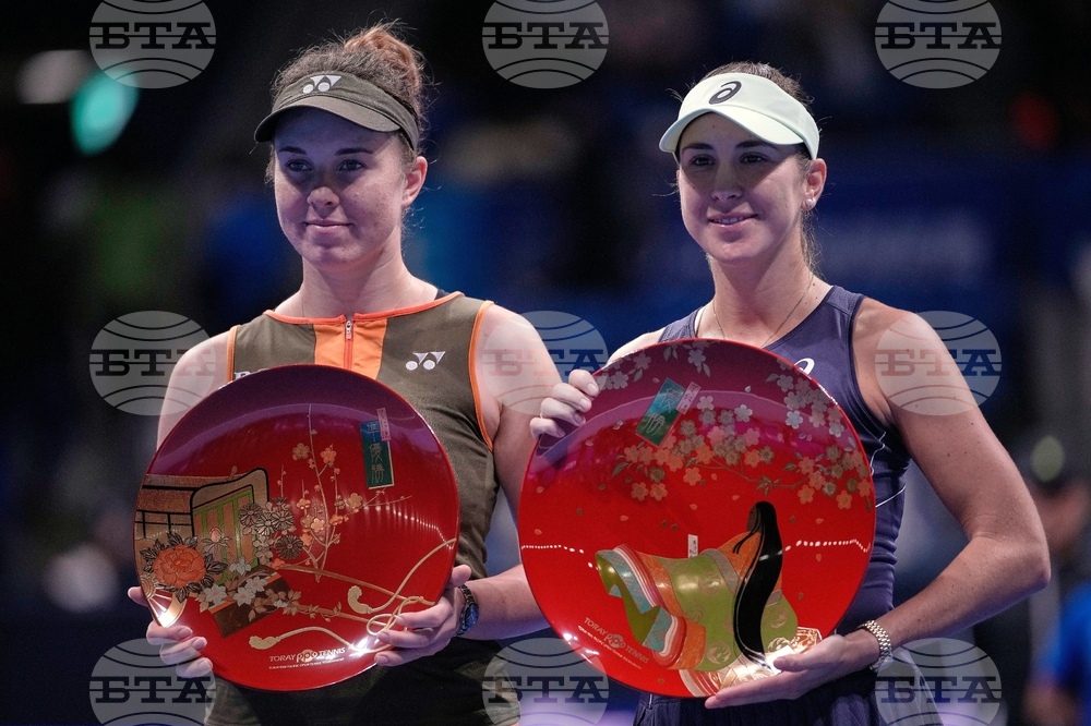 Switzerland's Belinda Bencic, right, and Czech Republic's Linda Noskova, left, pose with their trophies after the Pan Pacific Open women's tennis tournament at Ariake Coliseum, in Tokyo, Sunday, Oct. 26, 2025. (AP Photo/Louise Delmotte)