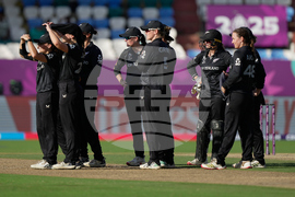 New Zealand's players wait for the third umpire's review for the wicket of England's Amy Jones during the ICC Women's Cricket World Cup match between England and New Zealand at ACA–VDCA Cricket Stadium in Visakhapatnam, India, Sunday, Oct. 26, 2025. (AP Photo/Mahesh Kumar A.)
