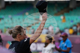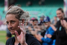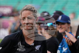 New Zealand's captain Sophie Devine reacts after playing her final One Day International match following the ICC Women's Cricket World Cup match against England at ACA–VDCA Cricket Stadium in Visakhapatnam, India, Sunday, Oct. 26, 2025. (AP Photo/Mahesh Kumar A.)
