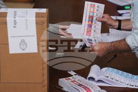 An electoral official handles a ballot to a voter during legislative midterm elections, in La Plata, Argentina, Sunday, Oct. 26, 2025. (AP Photo/Gustavo Garello)