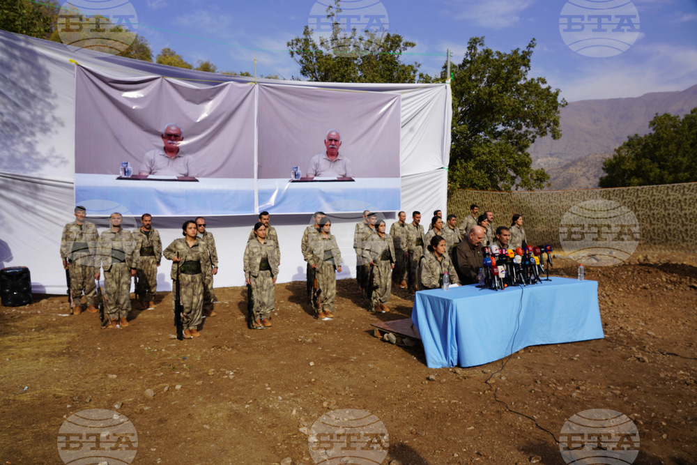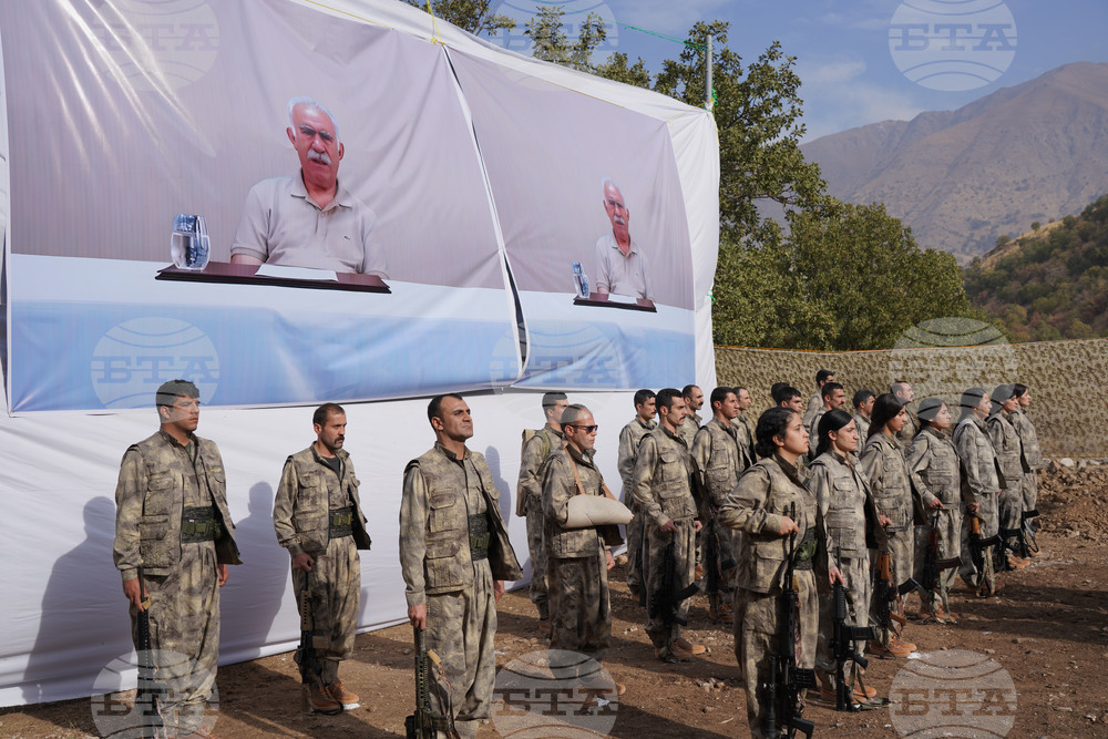Kurdistan Workers' Party (PKK) fighters, who reportedly withdrew from Turkey with their weapons, stand to attention during a ceremony in the Qandil area of northern, Iraq, Sunday, Oct 26, 2025. (AP Photo/Rashid Yahya)