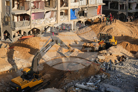 Palestinians watch machinery and some workers from Egypt searching for the bodies of hostages at Hamad City, in Khan Younis, southern Gaza Strip, Sunday, Oct. 26, 2025. (AP Photo/Jehad Alshrafi)