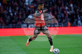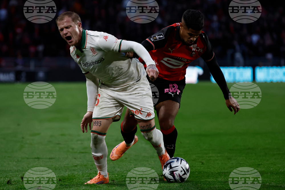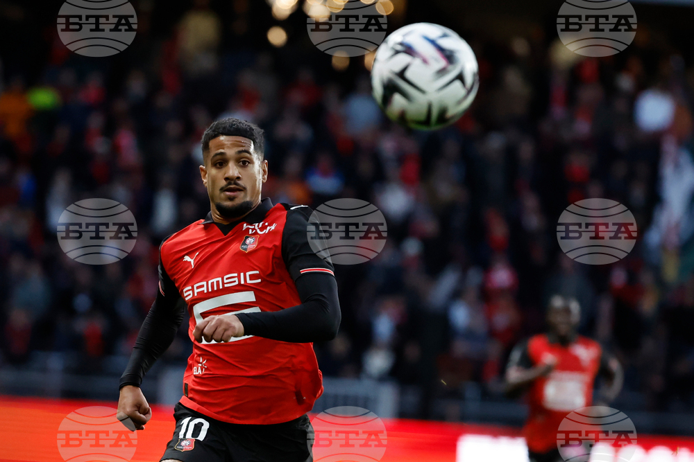 Rennes' Quentin Merlin goes for the ball during the French League One soccer match between Rennes and Nice, Sunday Oct. 26, 2025 in Rennes, western France. (AP Photo/Jeremias Gonzalez)