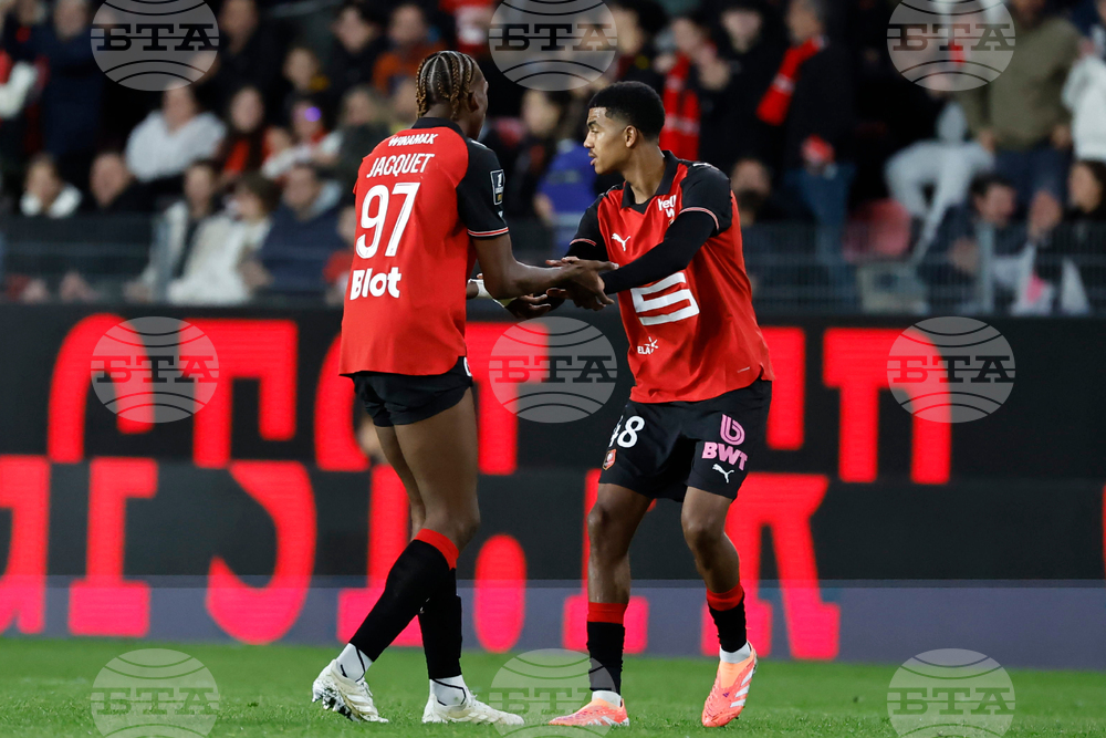 Rennes' Aboubakar Nagida, right, celebrates with Jeremy Jacquet after scoring his side's first goal, during the French League One soccer match between Rennes and Nice, Sunday Oct. 26, 2025 in Rennes, western France. (AP Photo/Jeremias Gonzalez)