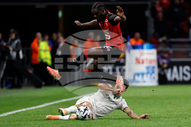 Nice's Jeremie Boga fights for the ball with Rennes' Mahdi Camara during the French League One soccer match between Rennes and Nice, Sunday Oct. 26, 2025 in Rennes, western France. (AP Photo/Jeremias Gonzalez)