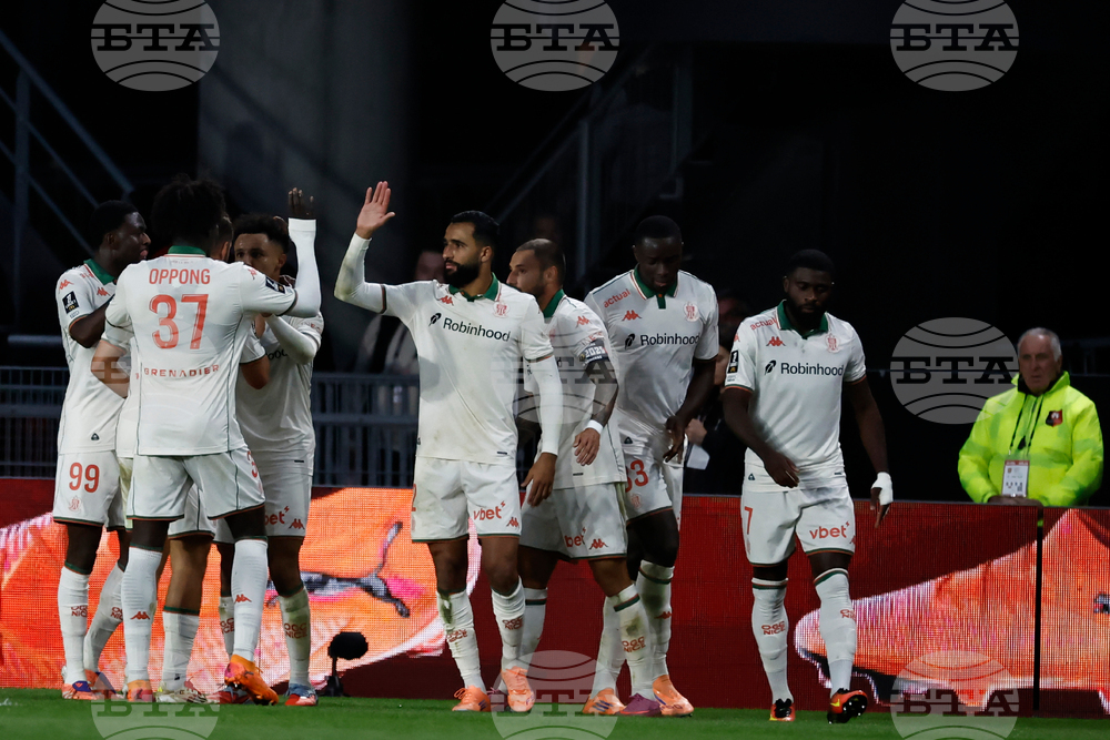 Nice's players celebrate after scoring a goal during the French League One soccer match between Rennes and Nice, Sunday Oct. 26, 2025 in Rennes, western France. (AP Photo/Jeremias Gonzalez)