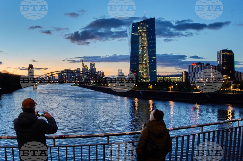 People walk over a bridge near the European Central Bank in Frankfurt, Germany, Sunday, Oct. 26, 2025. (AP Photo/Michael Probst)