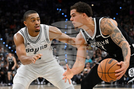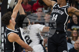 San Antonio Spurs guard Jordan McLaughlin (0) tangles with Brooklyn Nets guard Cam Thomas (24) during the second half of an NBA basketball game, Sunday, Oct. 26, 2025, in San Antonio. (AP Photo/Darren Abate)