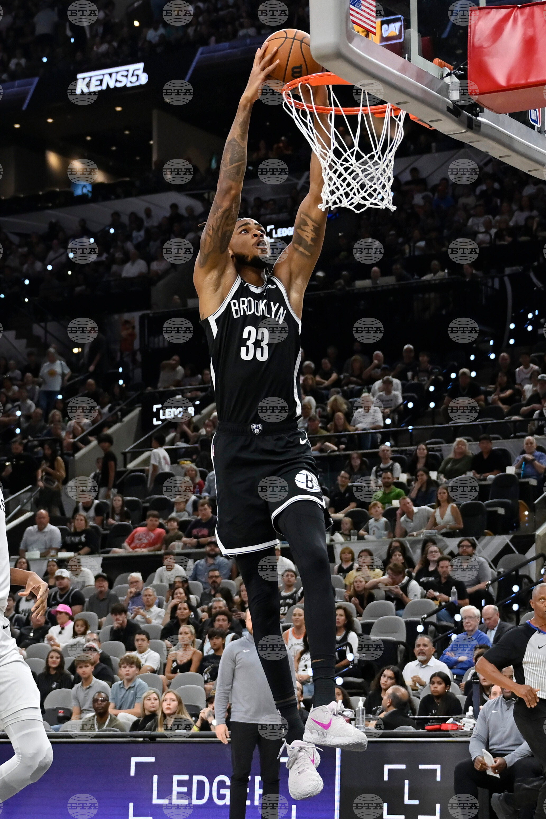 Brooklyn Nets center Nic Claxton dunks during the first half of an NBA basketball game against the San Antonio Spurs, Sunday, Oct. 26, 2025, in San Antonio. (AP Photo/Darren Abate)