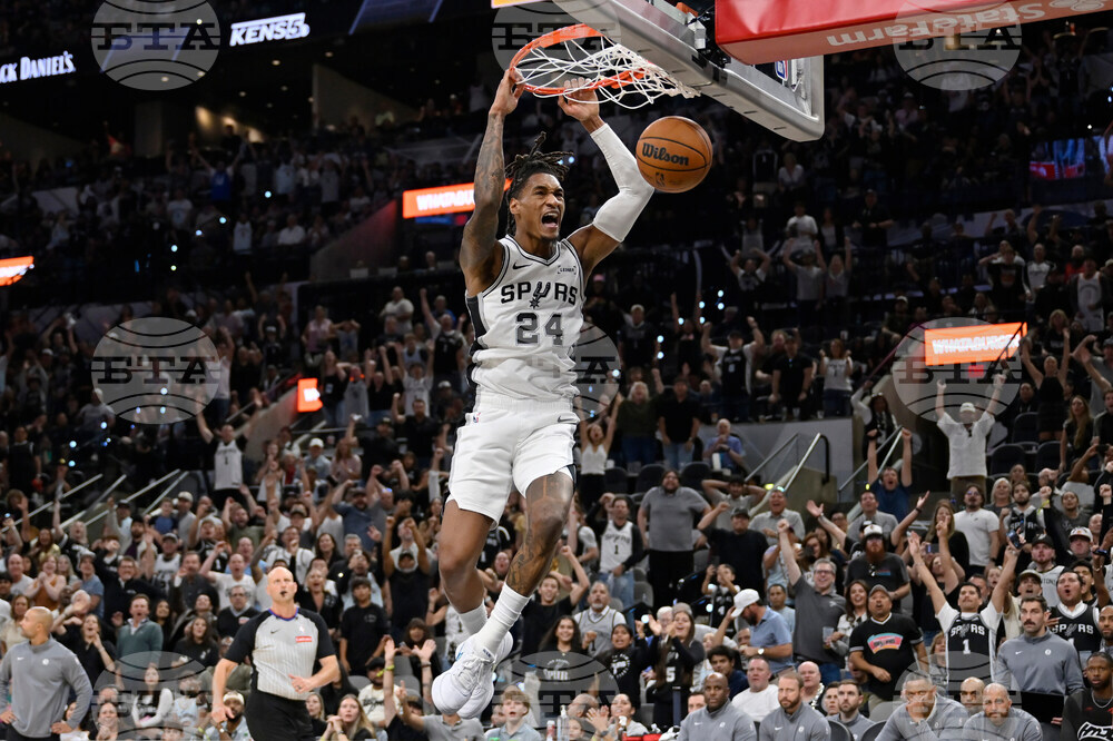 San Antonio Spurs guard Devin Vassell dunks during the second half of an NBA basketball game against the Brooklyn Nets, Sunday, Oct. 26, 2025, in San Antonio. (AP Photo/Darren Abate)
