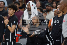 Brooklyn Nets head coach Jordi Fernandez yells to his players during the first half of their NBA basketball game against the San Antonio Spurs, Sunday, Oct. 26, 2025, in San Antonio. (AP Photo/Darren Abate)