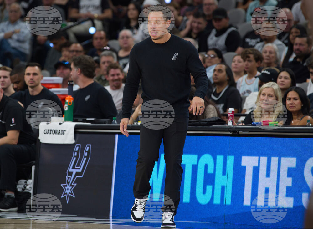 San Antonio Spurs head coach Mitch Johnson watches the first half of an NBA basketball game against the Brooklyn Nets, Sunday, Oct. 26, 2025, in San Antonio. (AP Photo/Darren Abate)