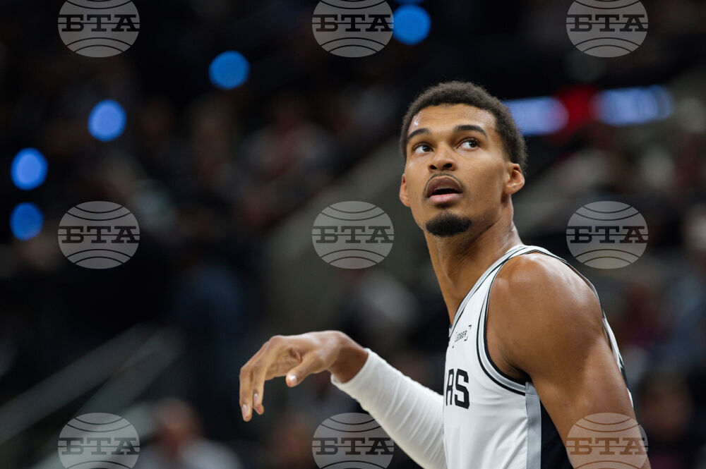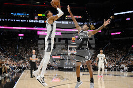 Brooklyn Nets guard Cam Thomas (24) shoots against San Antonio Spurs center Victor Wembanyama (1) during the first half of an NBA basketball game, Sunday, Oct. 26, 2025, in San Antonio. (AP Photo/Darren Abate)