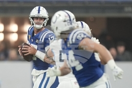 Indianapolis Colts quarterback Daniel Jones looks to throw during the first half an NFL football game against the Tennessee Titans, Sunday, Oct. 26, 2025, in Indianapolis. (AP Photo/Michael Conroy)