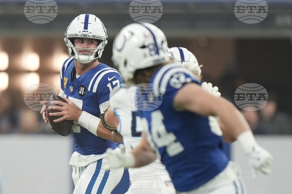 Indianapolis Colts quarterback Daniel Jones (17) looks to throw during the first half an NFL football game against the Tennessee Titans, Sunday, Oct. 26, 2025, in Indianapolis. (AP Photo/AJ Mast)