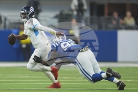 Tennessee Titans quarterback Cam Ward (1) is sacked by Indianapolis Colts defensive tackle DeForest Buckner (99) during the second half an NFL football game, Sunday, Oct. 26, 2025, in Indianapolis. (AP Photo/AJ Mast)