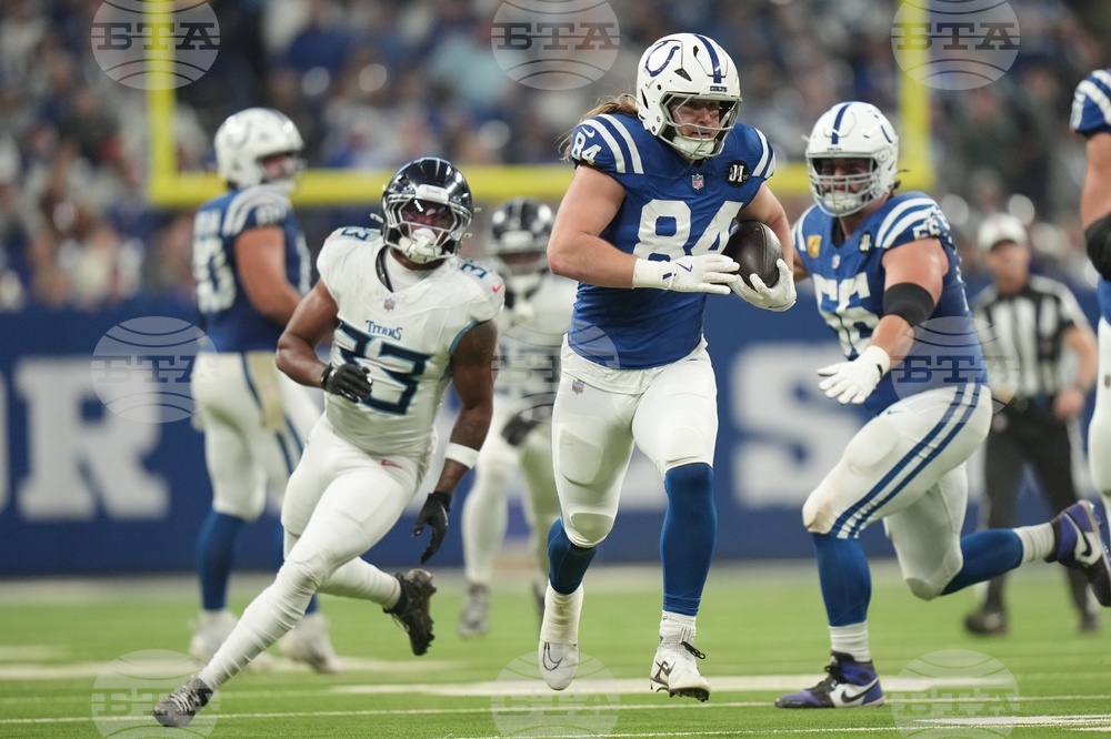 Indianapolis Colts tight end Tyler Warren (84) runs during the first half an NFL football game against the Tennessee Titans, Sunday, Oct. 26, 2025, in Indianapolis. (AP Photo/AJ Mast)