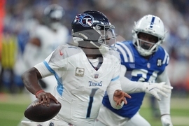 Tennessee Titans quarterback Cam Ward (1) runs against Indianapolis Colts safety Rodney Thomas II (25) during the first half an NFL football game, Sunday, Oct. 26, 2025, in Indianapolis. (AP Photo/Michael Conroy)