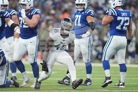 Indianapolis Colts' DeForest Buckner celebrates a sack during the second half an NFL football game against the Tennessee Titans, Sunday, Oct. 26, 2025, in Indianapolis. (AP Photo/Michael Conroy)