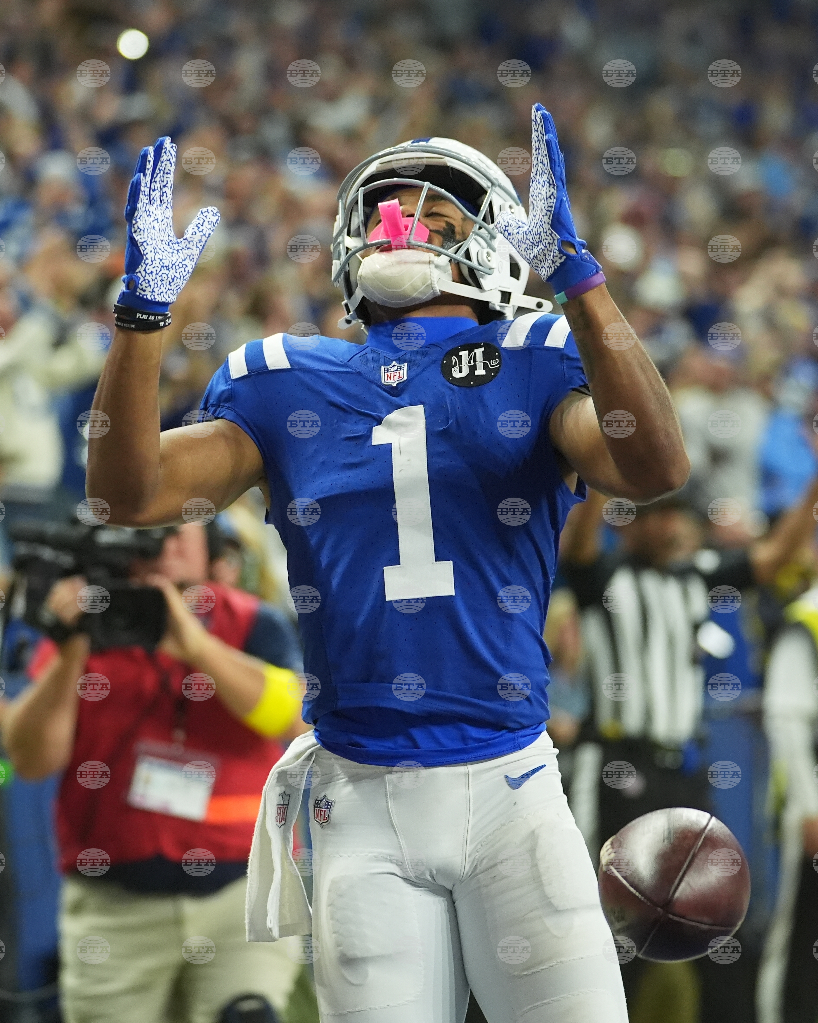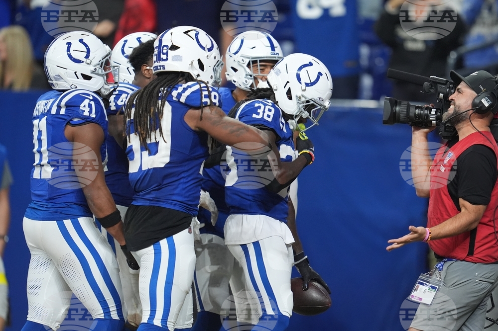 Indianapolis Colts wide receiver Josh Downs celebrates a touchdown reception during the second half an NFL football game against the Tennessee Titans, Sunday, Oct. 26, 2025, in Indianapolis. (AP Photo/Michael Conroy)