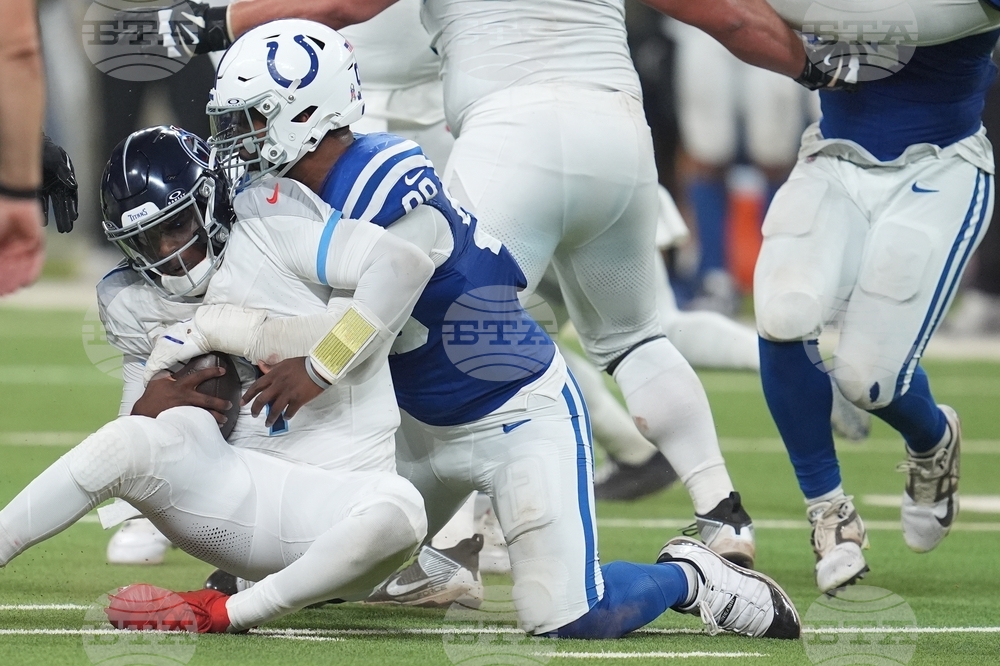 Tennessee Titans quarterback Cam Ward (1) is sacked by Indianapolis Colts defensive tackle DeForest Buckner (99) during the second half an NFL football game, Sunday, Oct. 26, 2025, in Indianapolis. (AP Photo/Michael Conroy)