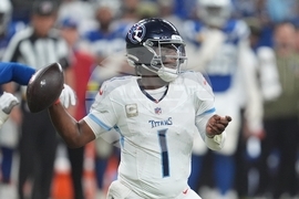 Tennessee Titans quarterback Cam Ward (1) throws during the first half an NFL football game against the Indianapolis Colts, Sunday, Oct. 26, 2025, in Indianapolis. (AP Photo/Michael Conroy)