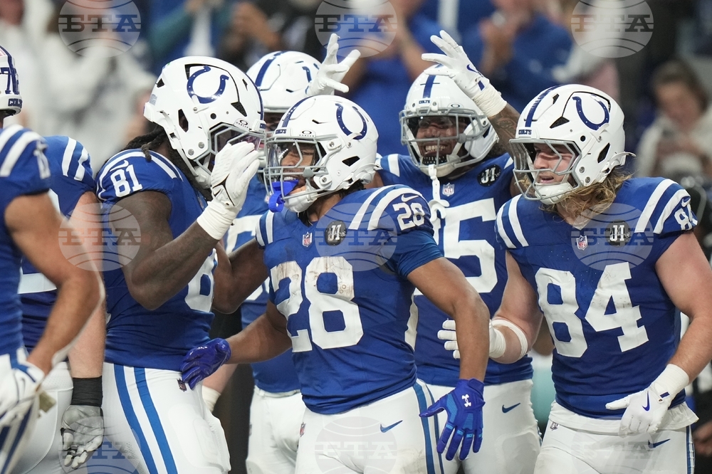 Indianapolis Colts running back Jonathan Taylor (28) celebrates a touchdown with his teammates during the second half an NFL football game against the Tennessee Titans, Sunday, Oct. 26, 2025, in Indianapolis. (AP Photo/AJ Mast)