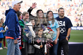 Connecticut native and former United States goalkeeper Alyssa Naeher, center top, waves to fans as she is surrounded by family during a ceremony honoring her before an international friendly women's soccer match against Portugal, Sunday, Oct. 26, 2025, in East Hartford, Conn. (AP Photo/Jessica Hill)