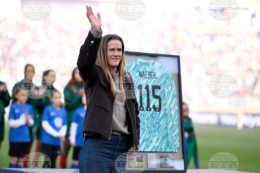 Connecticut native and former United States goalkeeper Alyssa Naeher waves to fans during a ceremony honoring her before an international friendly women's soccer match against Portugal, Sunday, Oct. 26, 2025, in East Hartford, Conn. (AP Photo/Jessica Hill)