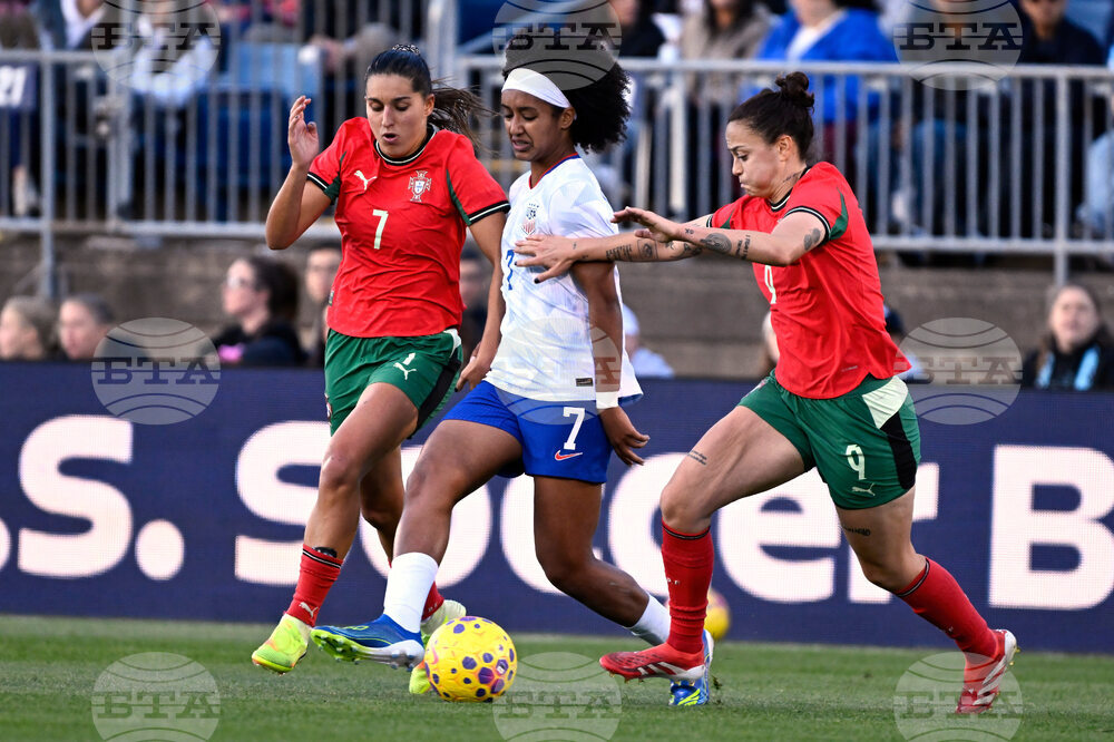 United States' Lily Yohannes, center, is pressured by Portugal's Kika Nazareth, left, and Stephanie Riberio, right, during the first half of an international friendly women's soccer match, Sunday, Oct. 26, 2025, in East Hartford, Conn. (AP Photo/Jessica Hill)