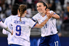 United States' Sam Coffey (17) celebrates after her goal during the second half of an international friendly women's soccer match against Portugal, Sunday, Oct. 26, 2025, in East Hartford, Conn. (AP Photo/Jessica Hill)