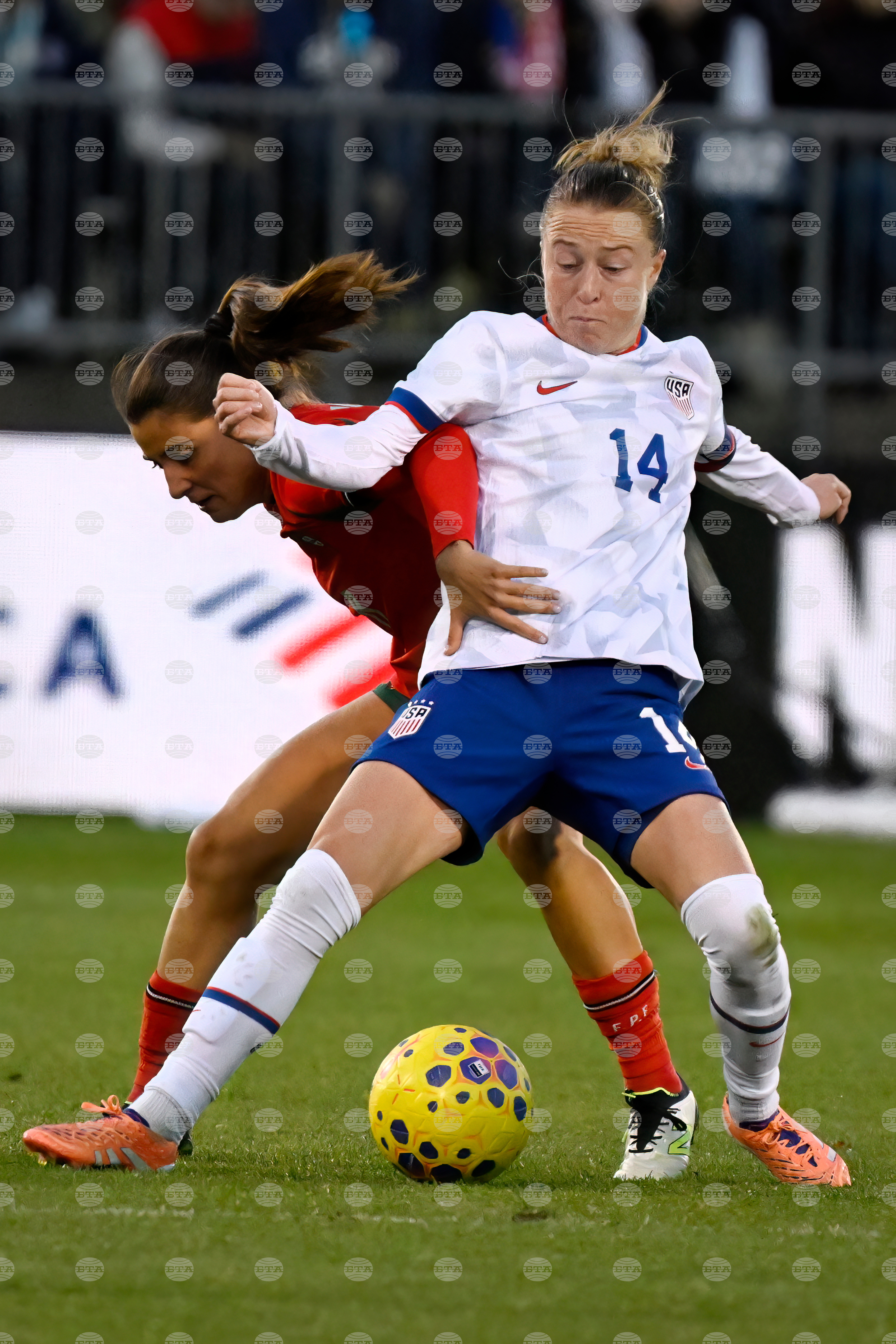 United States' Emily Sonnett (14) keeps the ball from Portugal's Maria Alagoa, left, during the second half of an international friendly women's soccer match, Sunday, Oct. 26, 2025, in East Hartford, Conn. (AP Photo/Jessica Hill)