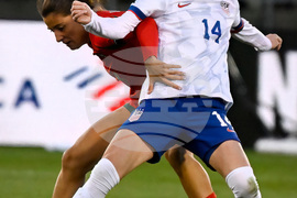 United States' Emily Fox (23) and Portugal's Catarina Amado, bottom, vie for the ball during the second half of an international friendly women's soccer match, Sunday, Oct. 26, 2025, in East Hartford, Conn. (AP Photo/Jessica Hill)