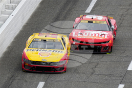 Ryan Blaney (12) leads Christopher Bell (20) during a NASCAR Cup series auto race in Martinsville, Va., Sunday, Oct. 26, 2025. (AP Photo/Chuck Burton)