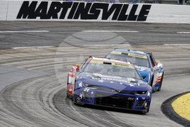Ryan Blaney (12) leads Cody Ware (51) out of Turn 4 during a NASCAR Cup series auto race in Martinsville, Va., Sunday, Oct. 26, 2025. (AP Photo/Terry Renna)