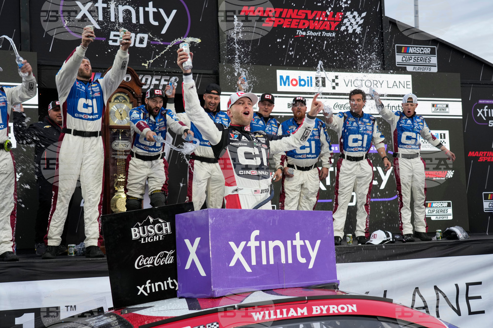 William Byron, front, celebrates in Victory Lane after winning a NASCAR Cup series auto race in Martinsville, Va., Sunday, Oct. 26, 2025. (AP Photo/Chuck Burton)