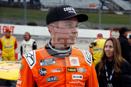 Christopher Bell reacts after climbing from his car after a NASCAR Cup series auto race in Martinsville, Va., Sunday, Oct. 26, 2025. (AP Photo/Terry Renna)