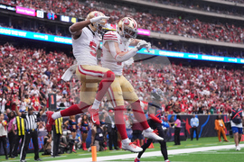 San Francisco 49ers wide receiver Demarcus Robinson (5) is congratulated by teammate Kyle Juszczyk after scoring on a two-point conversion during the second half of an NFL football game against the Houston Texans Sunday, Oct. 26, 2025, in Houston. (AP Photo/Eric Gay)