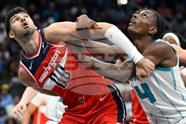 Washington Wizards forward Tristan Vukcevic (00) and Charlotte Hornets forward Moussa Diabate, right, look for a rebound during the first half of an NBA basketball game Sunday, Oct. 26, 2025, in Washington. (AP Photo/John McDonnell)