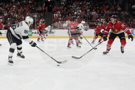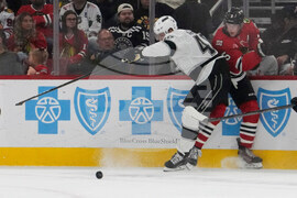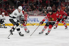 Los Angeles Kings right wing Joel Armia, left, and Chicago Blackhawks defenseman Connor Murphy, right, go for the puck during the first period of an NHL hockey game Sunday, Oct. 26, 2025, in Chicago. (AP Photo/David Banks)