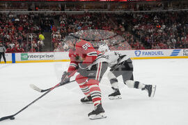 Chicago Blackhawks defenseman Alex Vlasic (72) defends against Los Angeles Kings left wing Andrei Kuzmenko (96) during the first period of an NHL hockey game Sunday, Oct. 26, 2025, in Chicago. (AP Photo/David Banks)